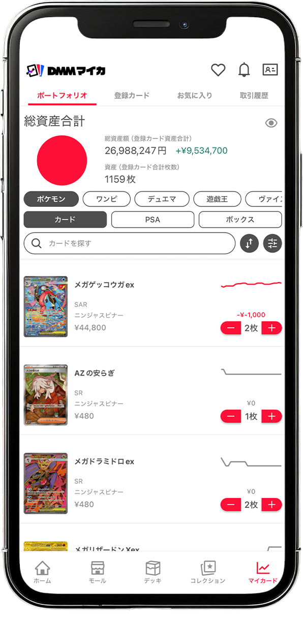 カードだけでなくPSA、未開封ボックスやパックの相場情報も日々自動更新するので、今の資産が確認することが出来ます。